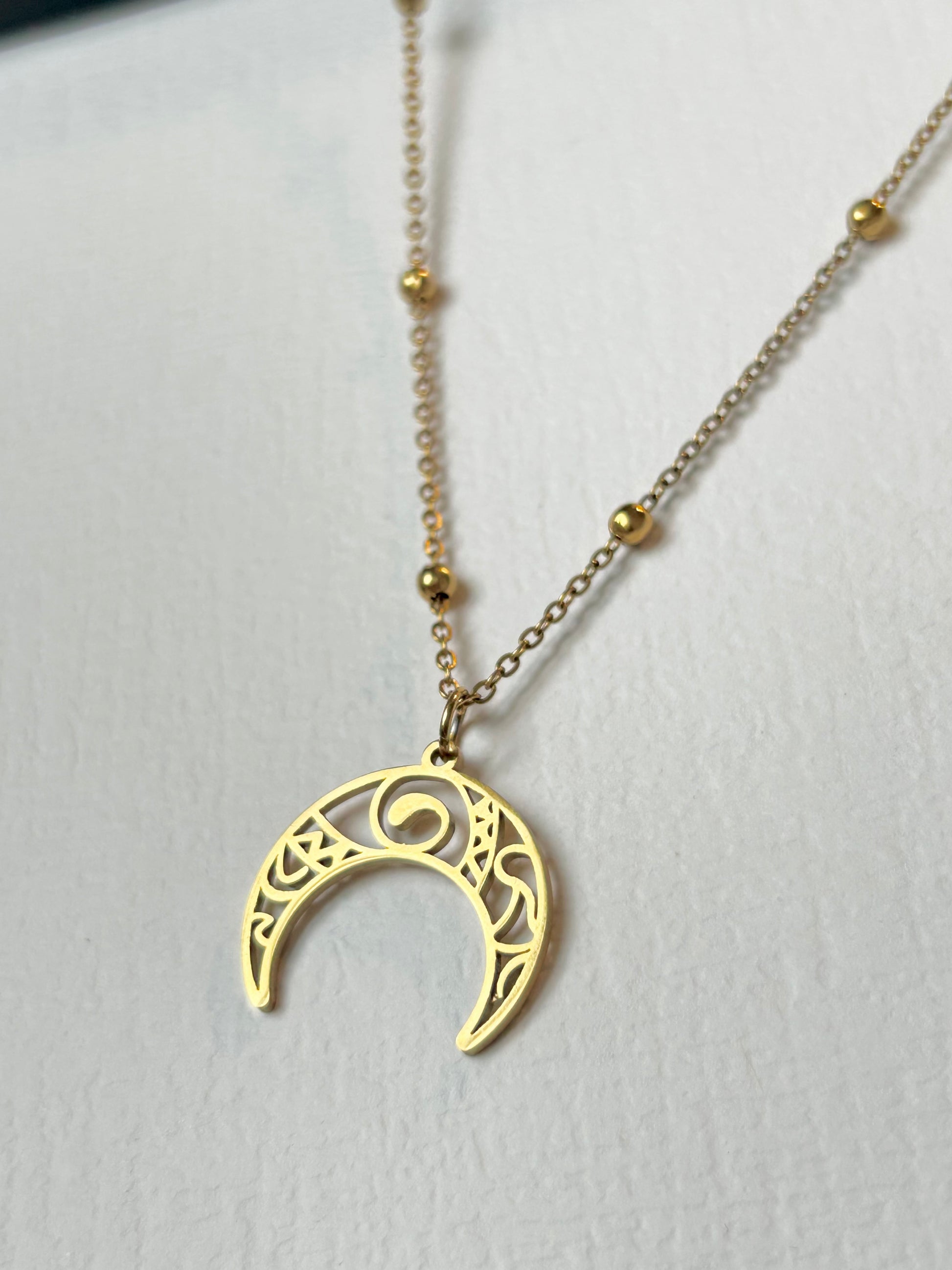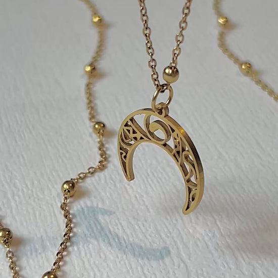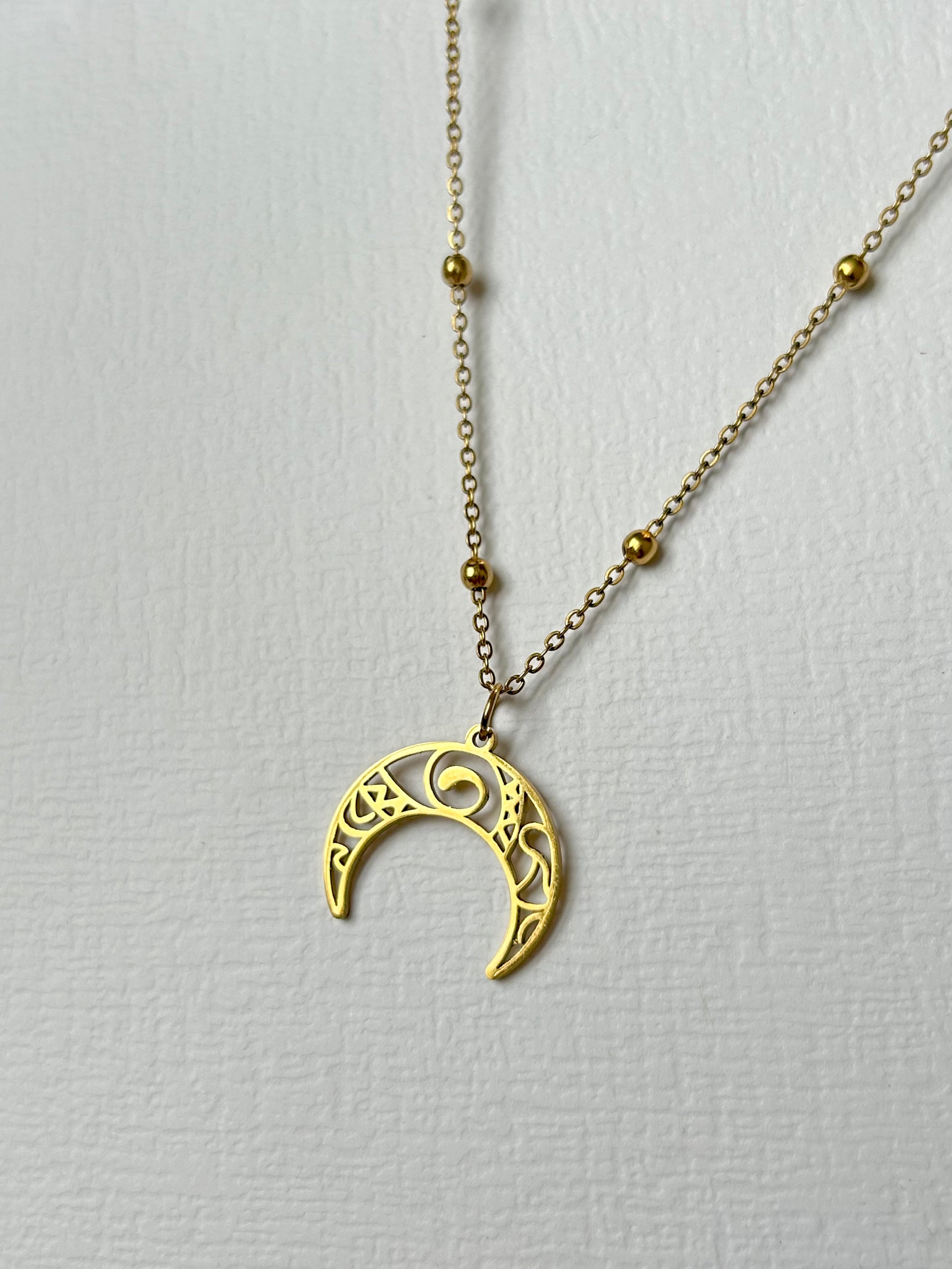 Magiczny naszyjnik YUKI z księżycem. Wykonany ze stali szlachetnej pokrytej cienką warstwą złocenia, gwarantuje jakość i trwałość.