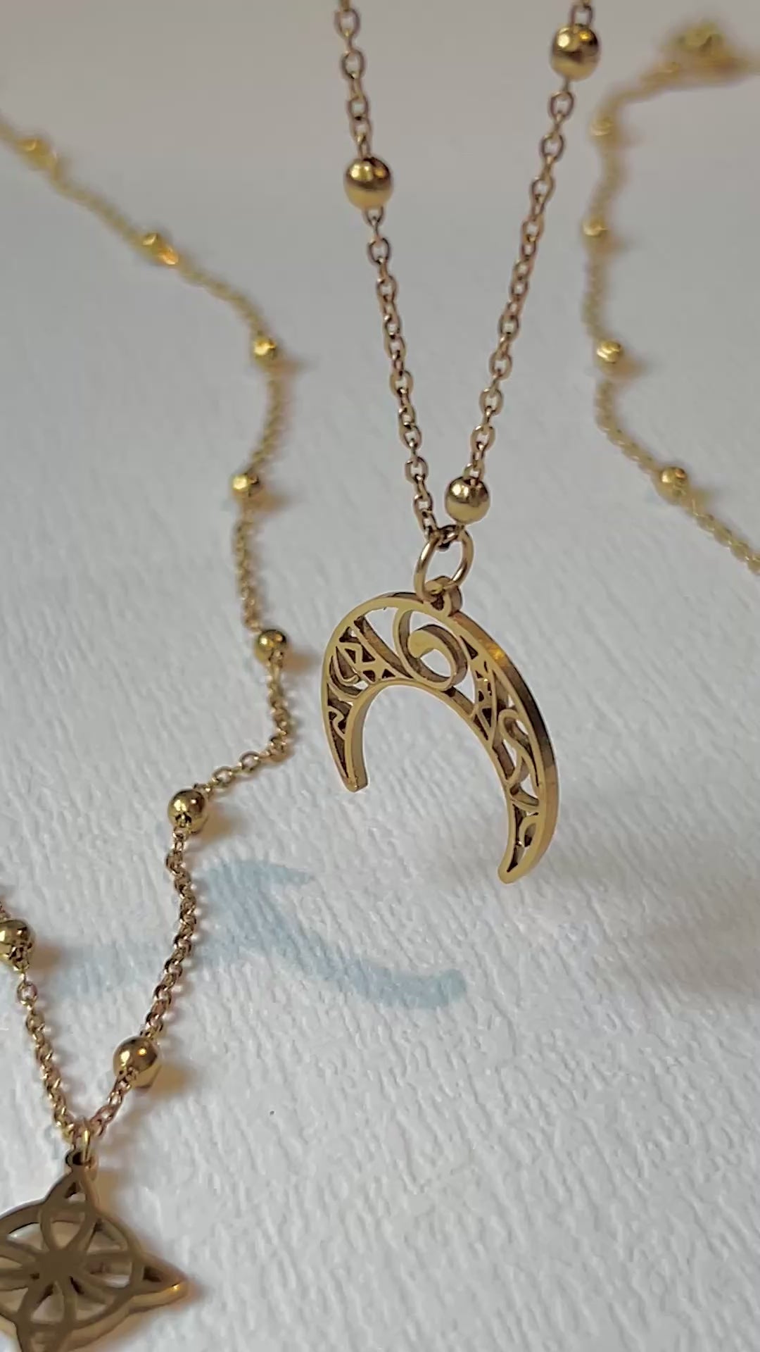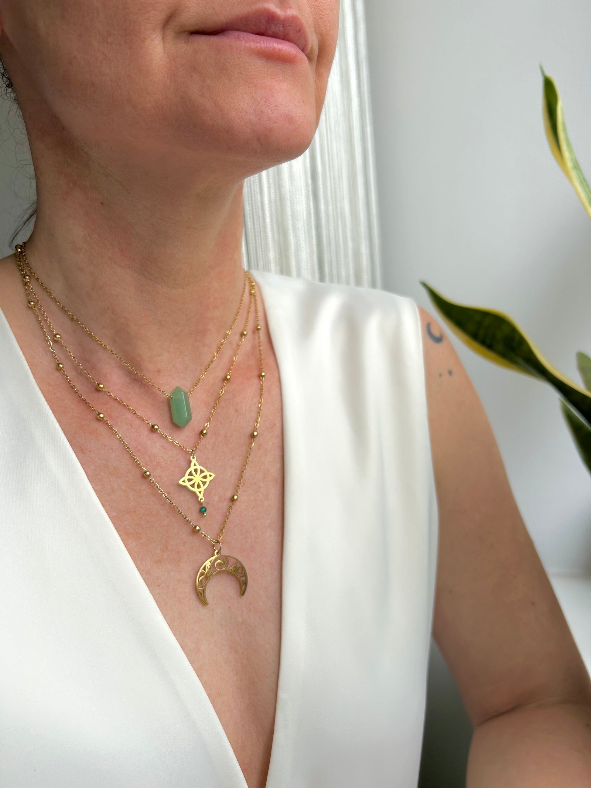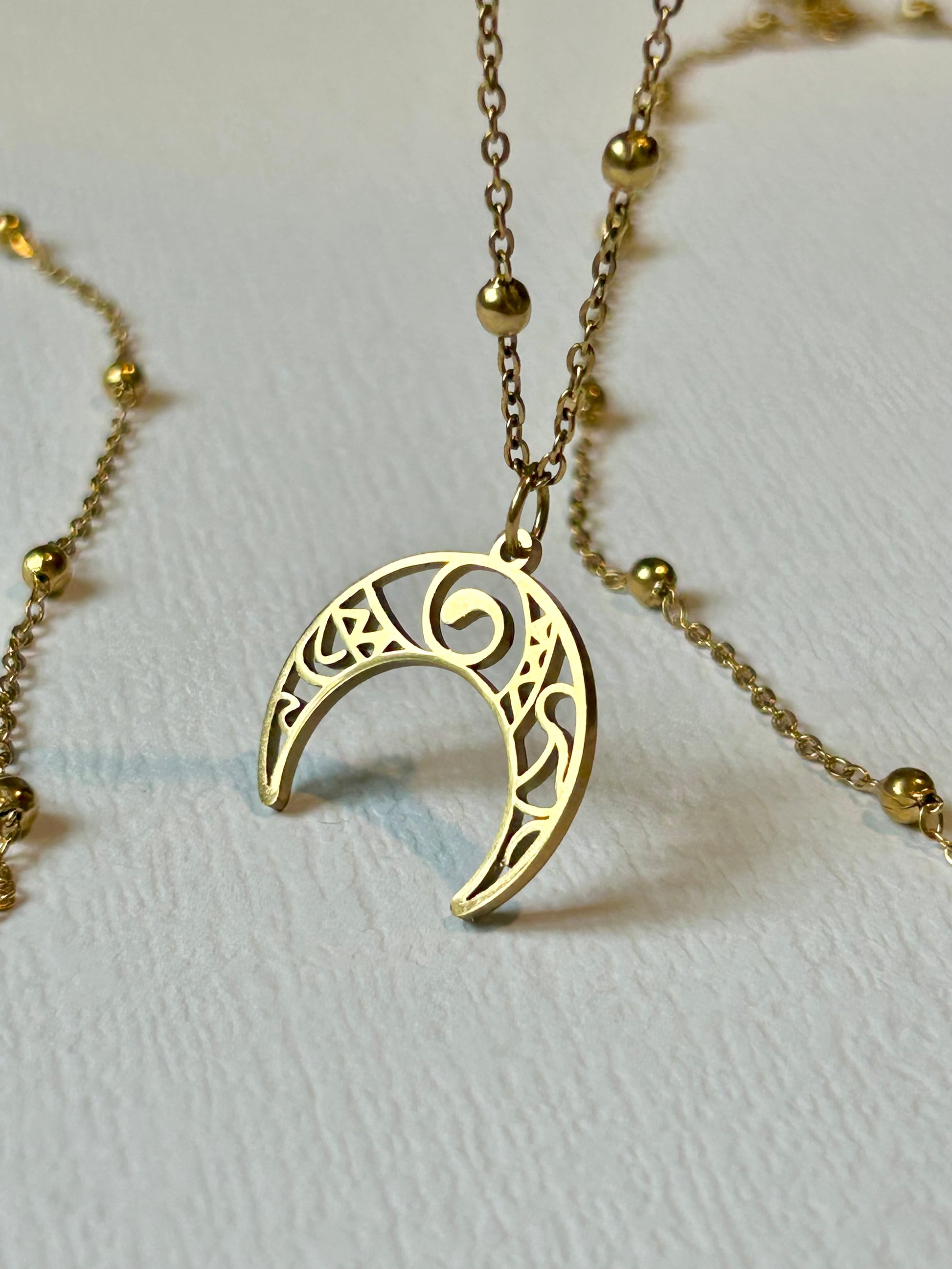 Magiczny naszyjnik YUKI z księżycem. Wykonany ze stali szlachetnej pokrytej cienką warstwą złocenia, gwarantuje jakość i trwałość.