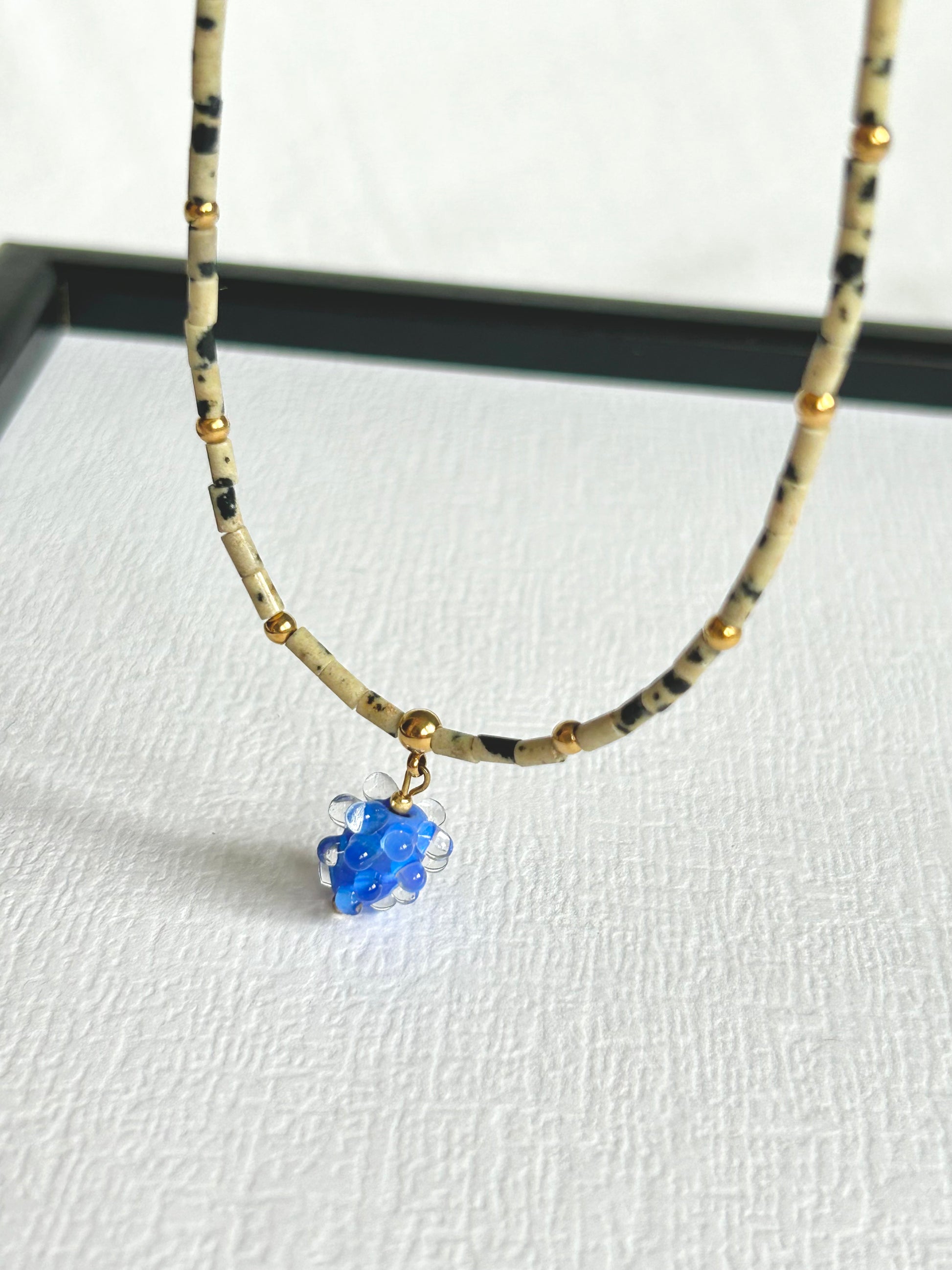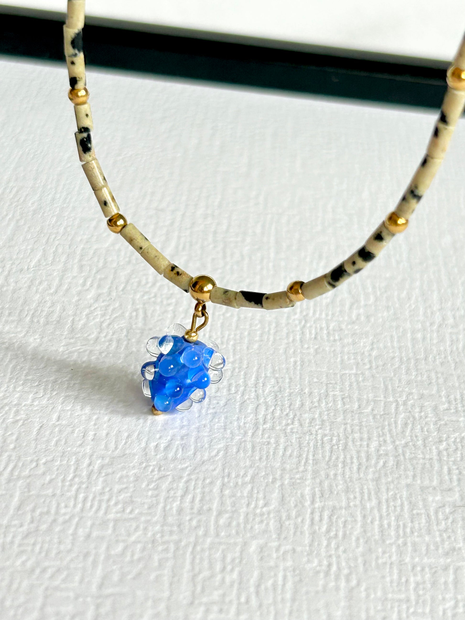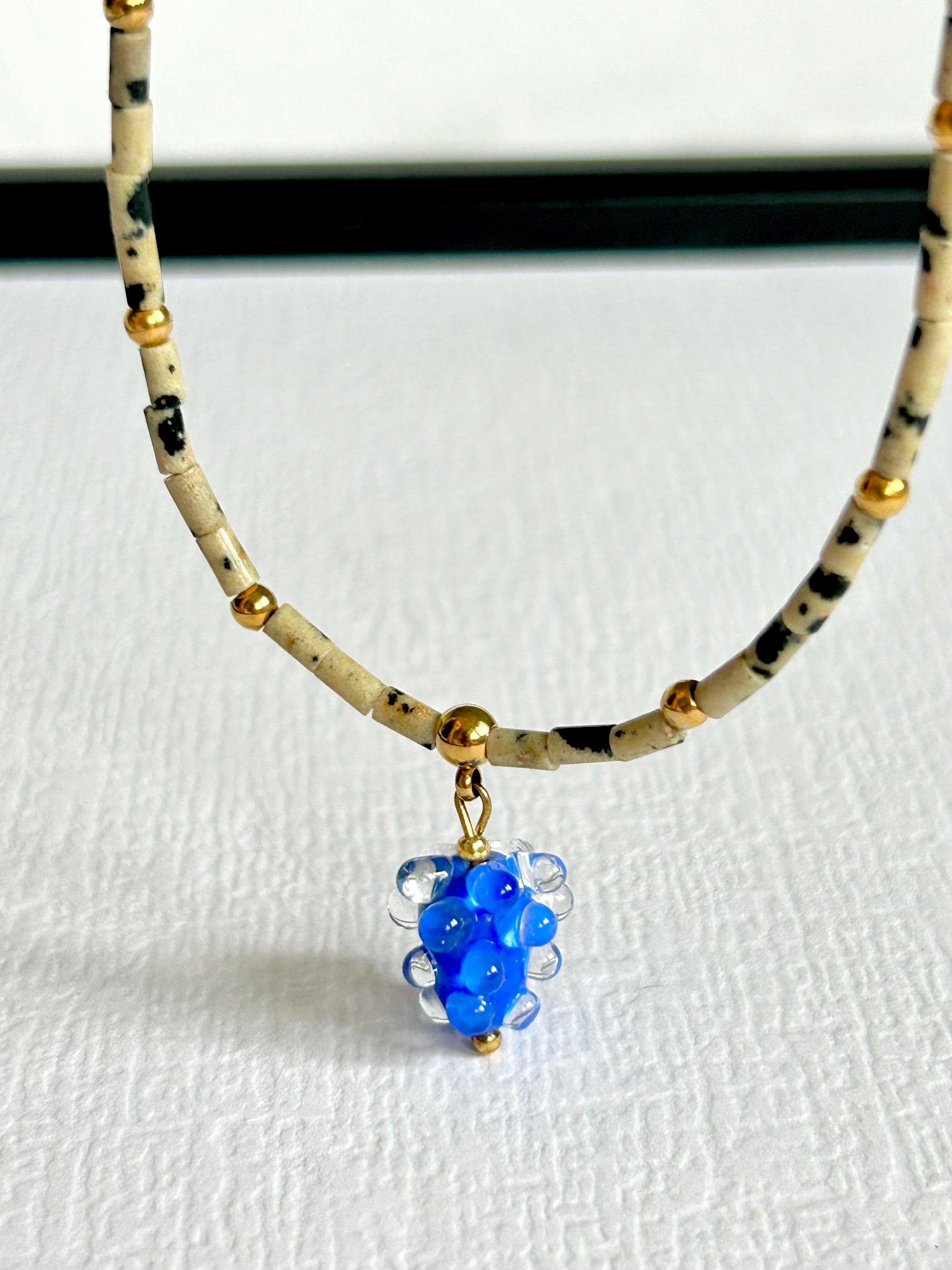 Ręcznie wykonany naszyjnik / choker z kamieni naturalnych i szklaną zawieszką jeżynka.