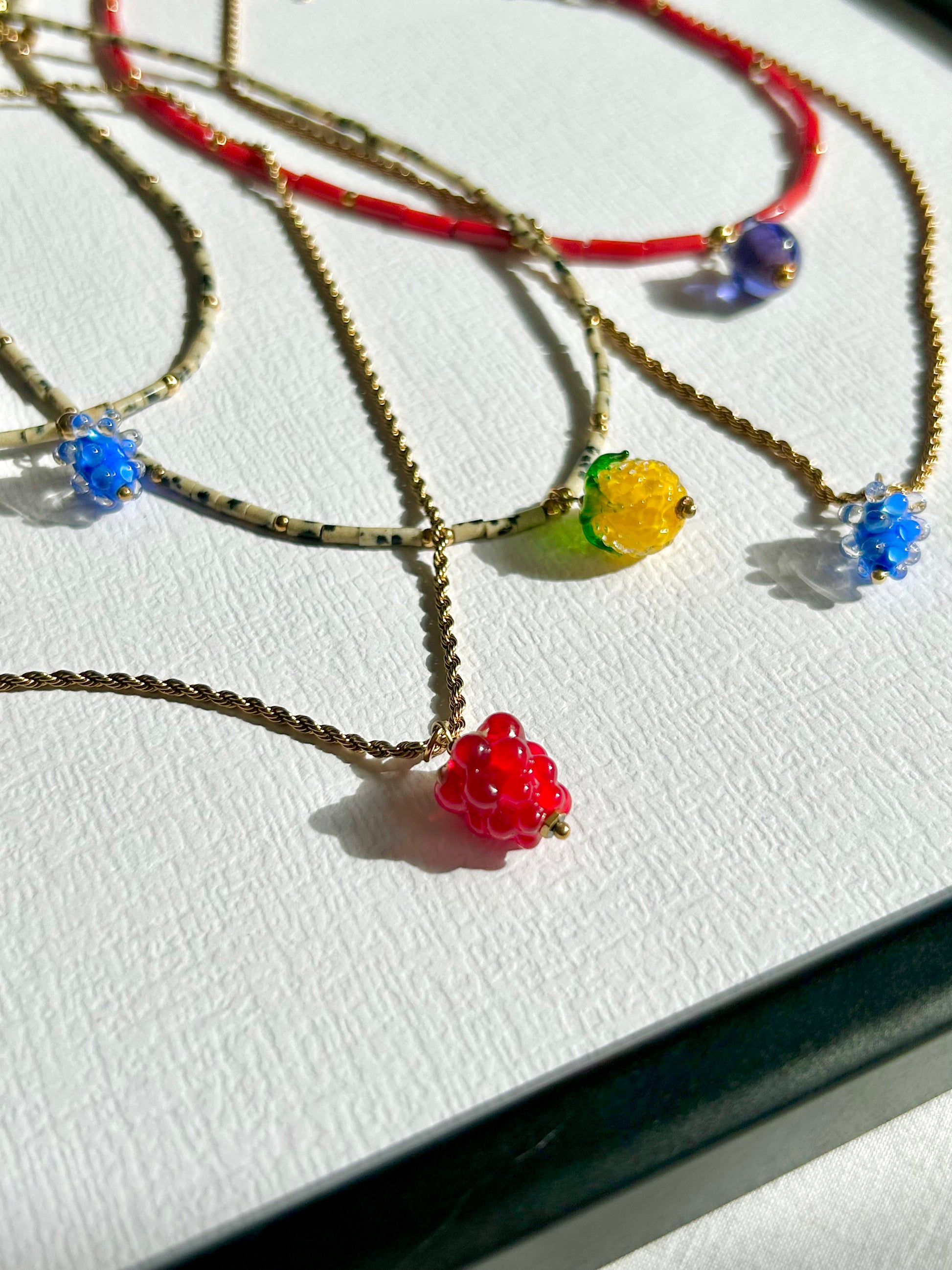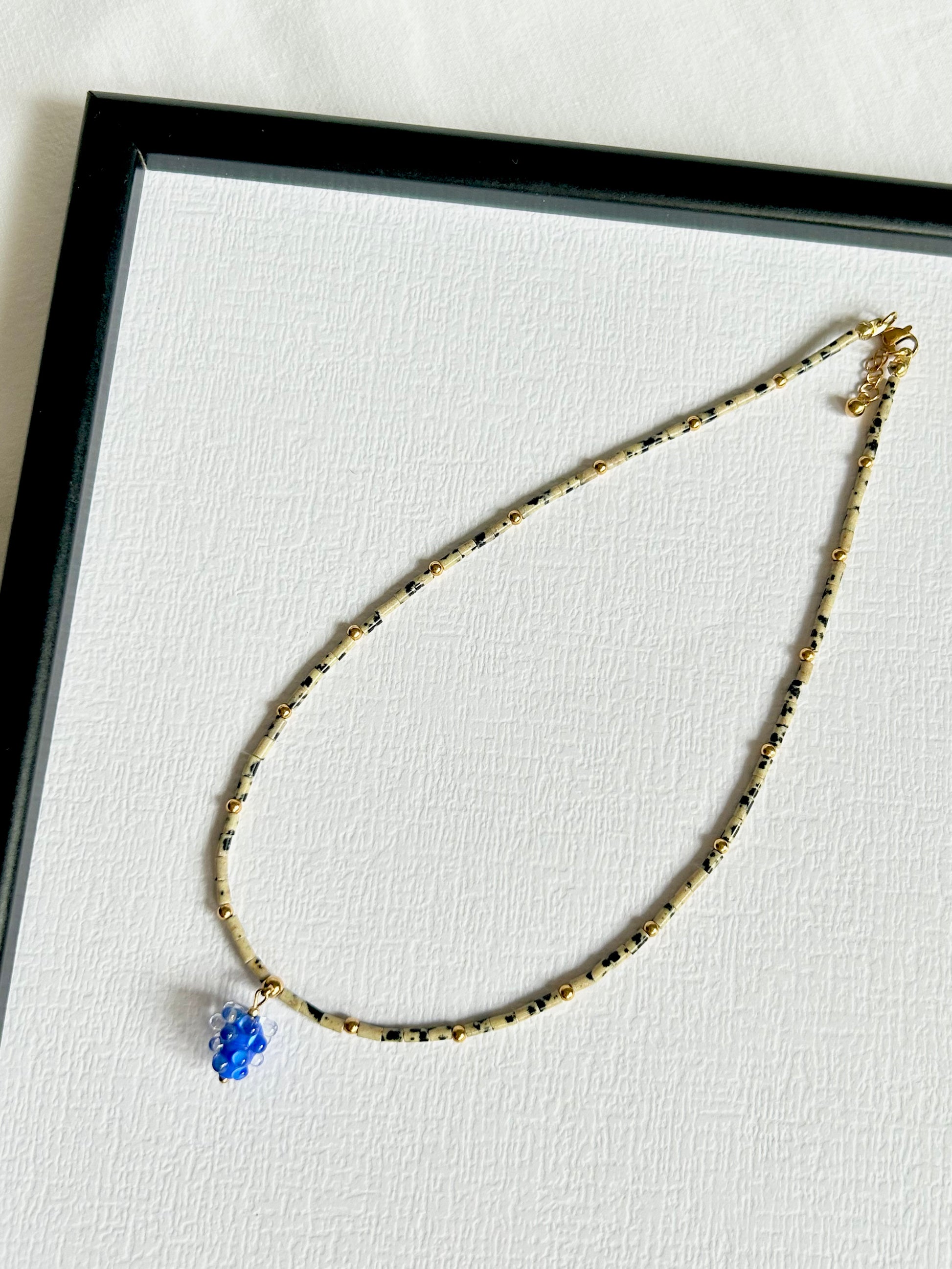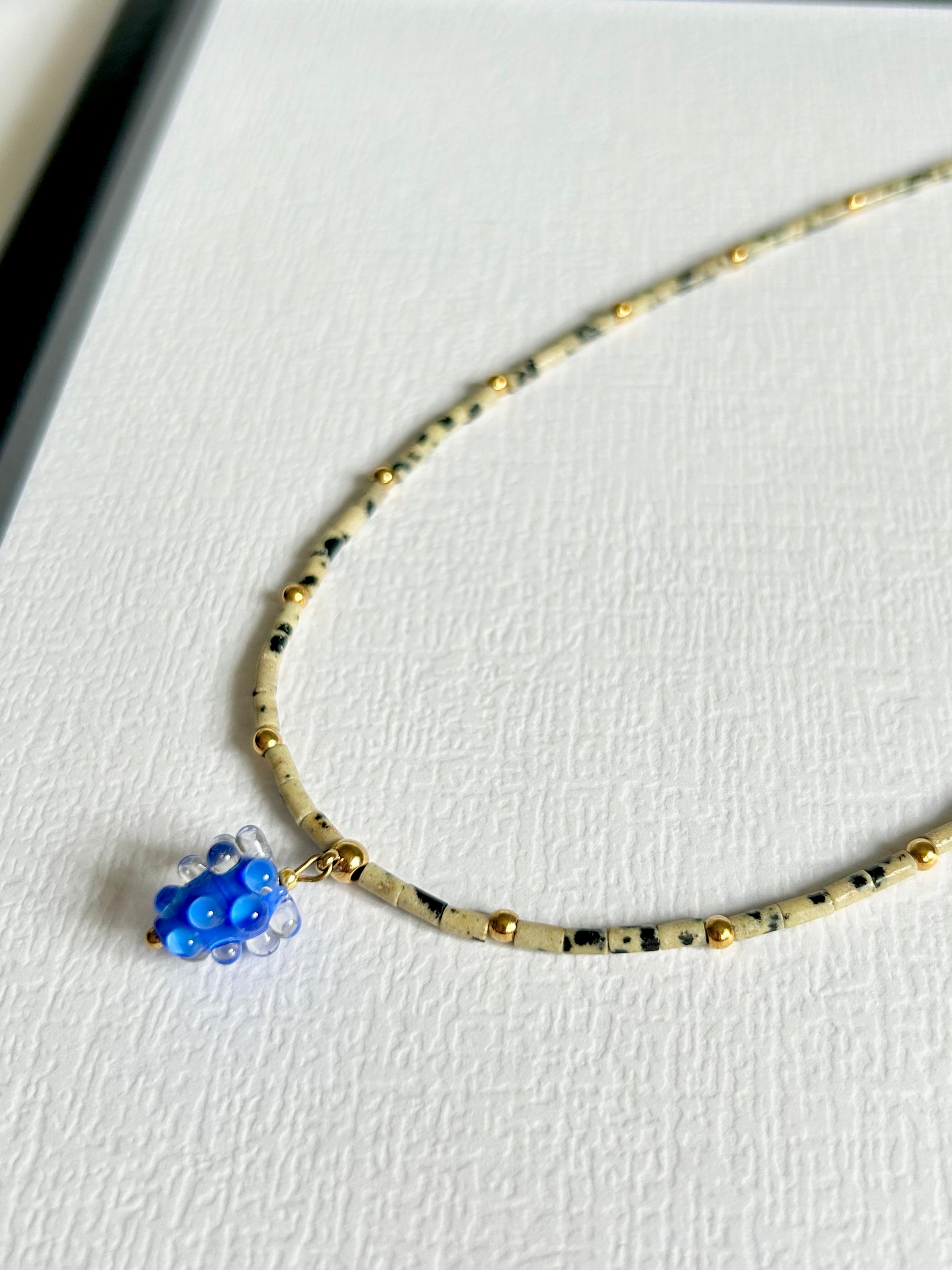 Ręcznie wykonany naszyjnik / choker z kamieni naturalnych i szklaną zawieszką jeżynka.