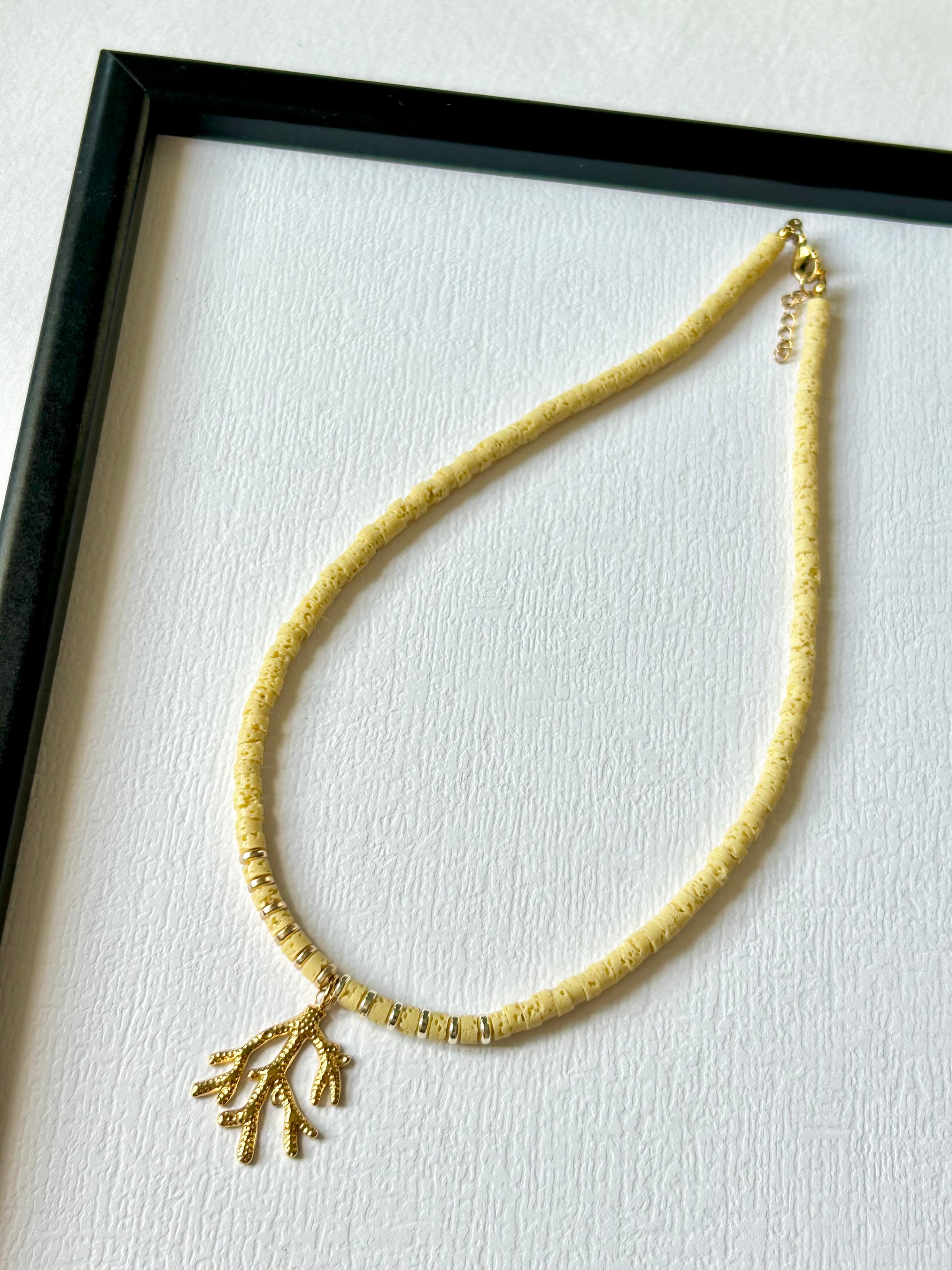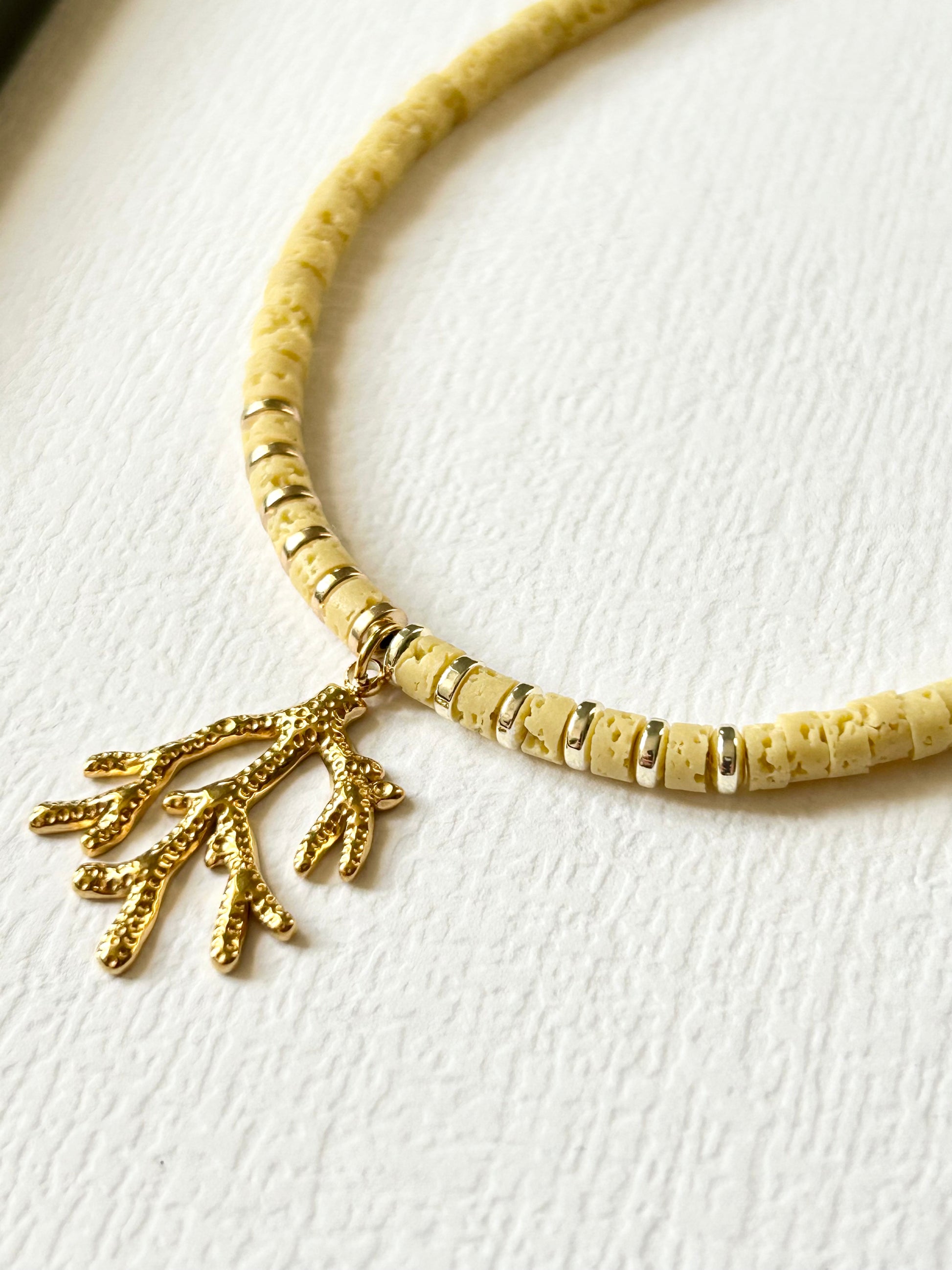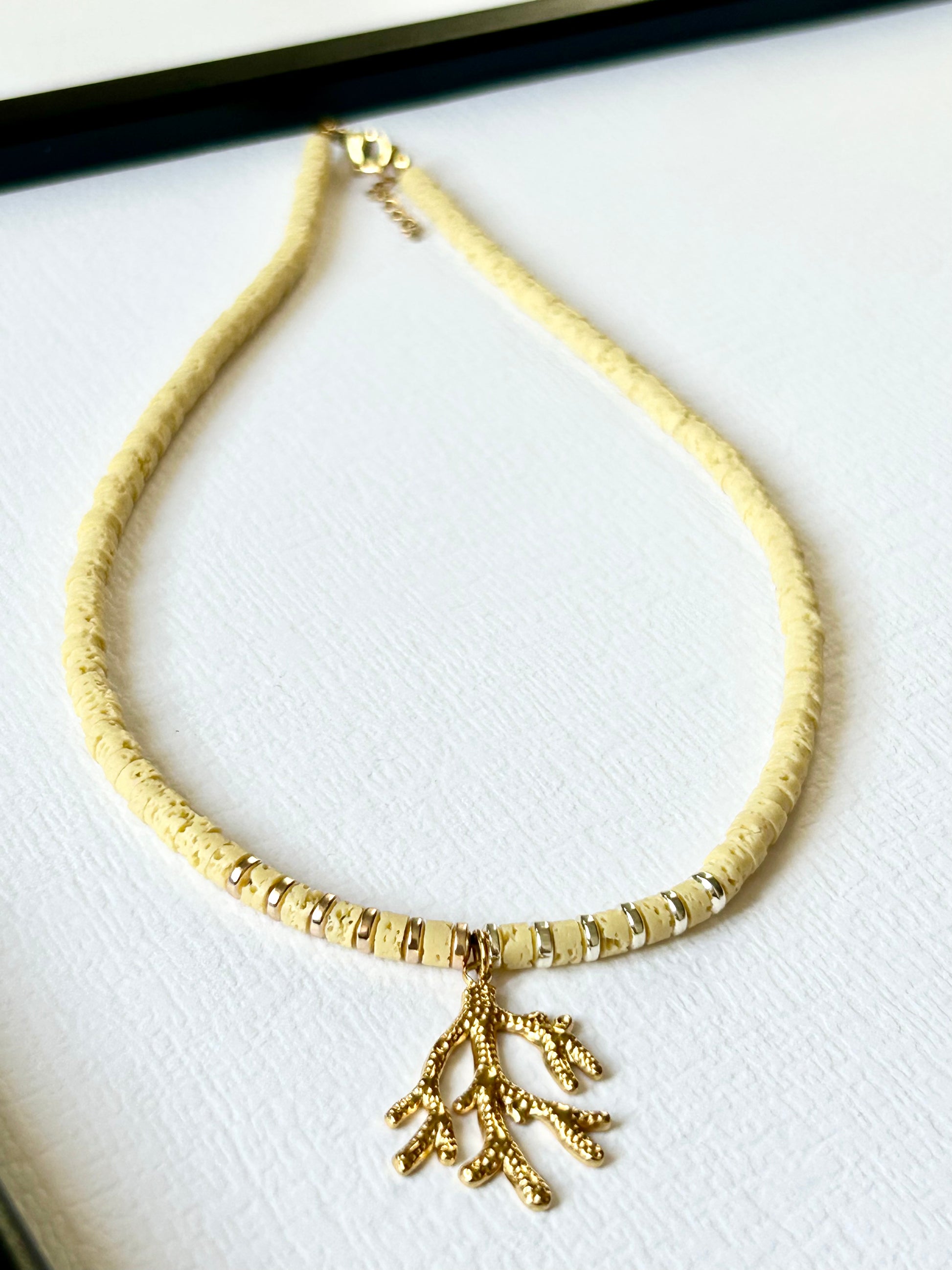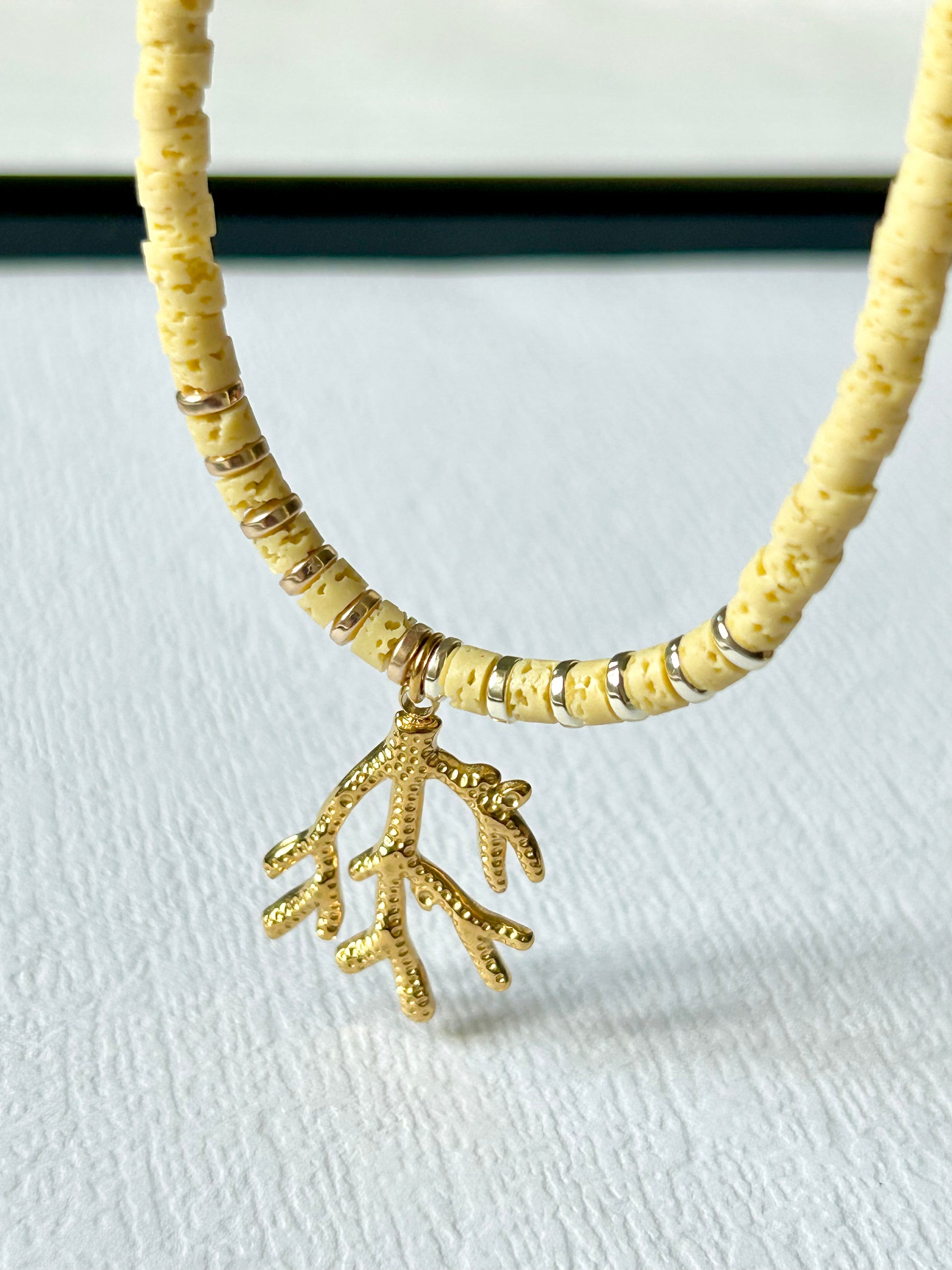 Ręcznie wykonany choker z kamieni naturalnych,przekładnay hematytem zwieńczony rafą koralową ze stali szlachetnej w kolorze złotym.