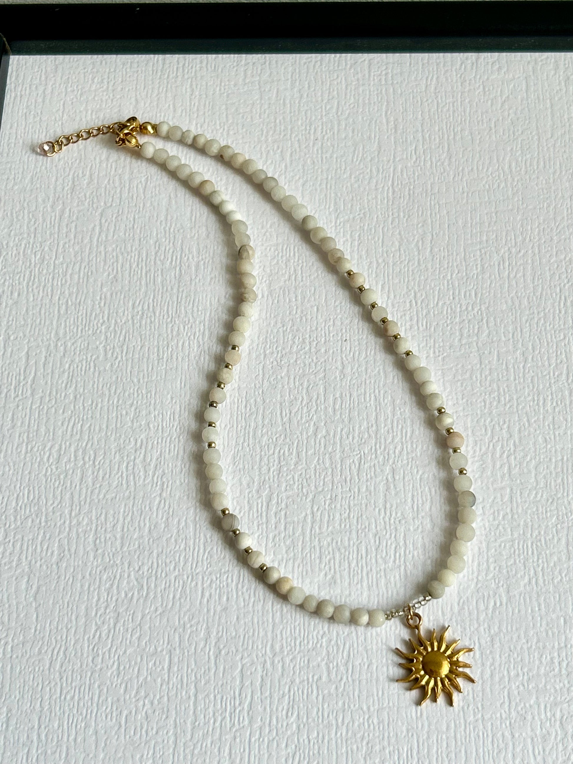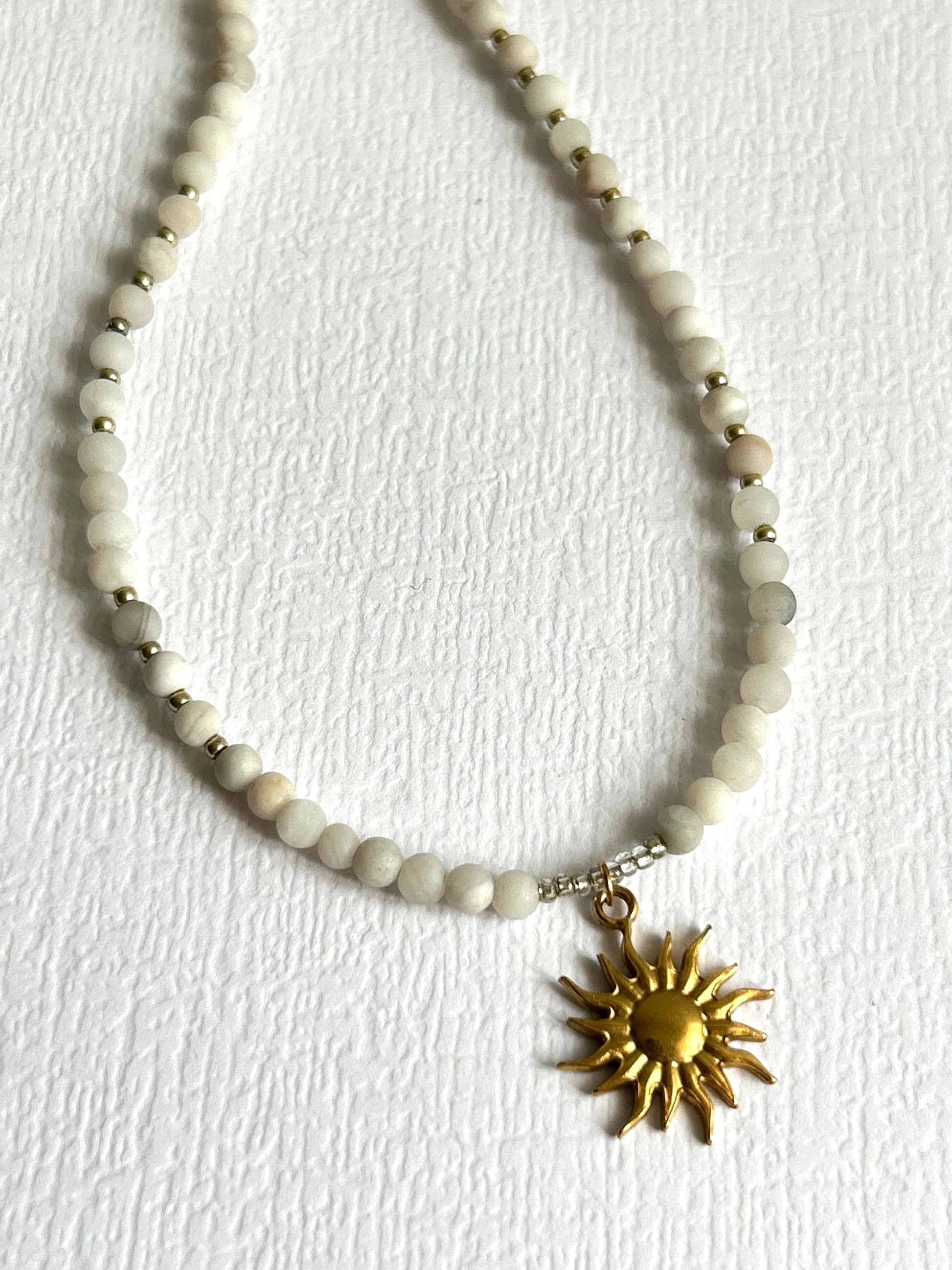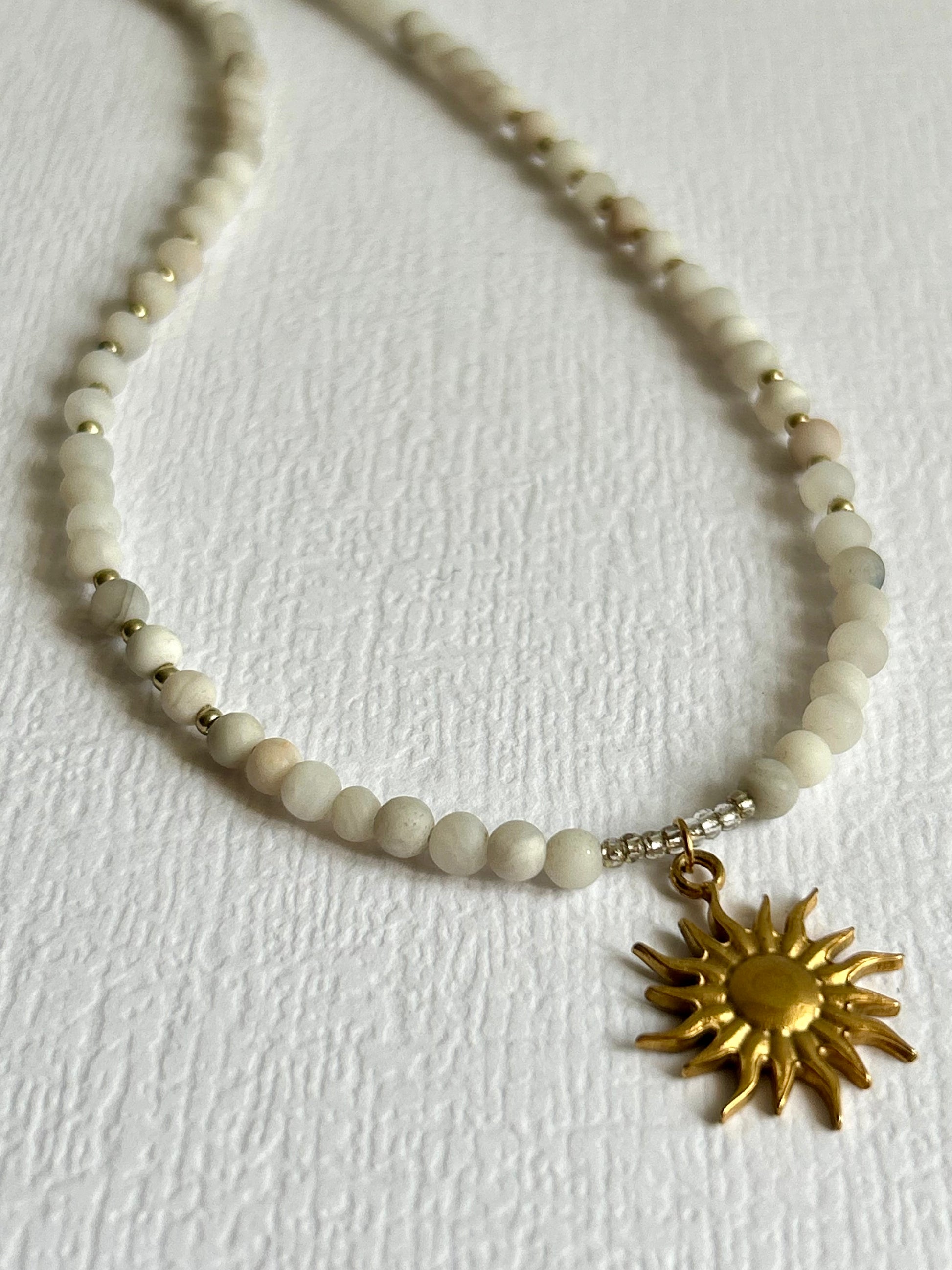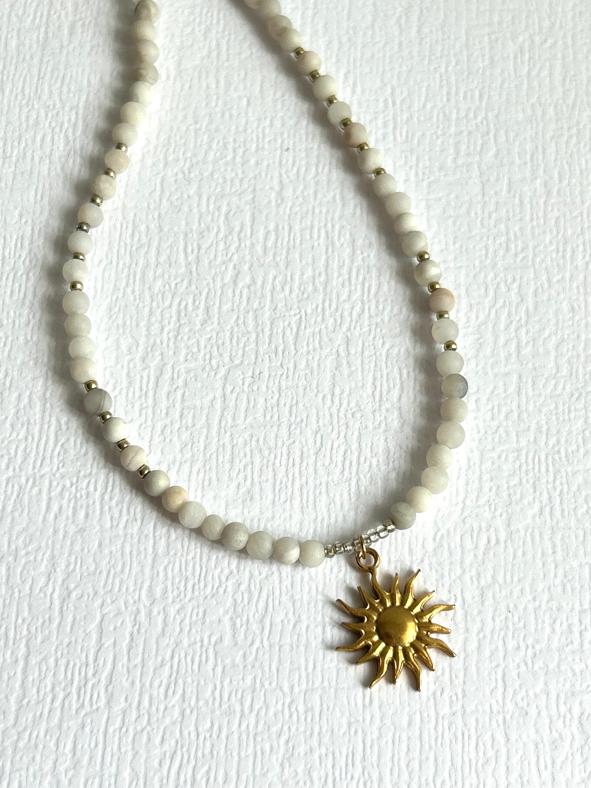 Ręcznie wykonany naszyjnik z kamieni naturalnych zwieńczony słoneczkiem ze stali szlachetnej.