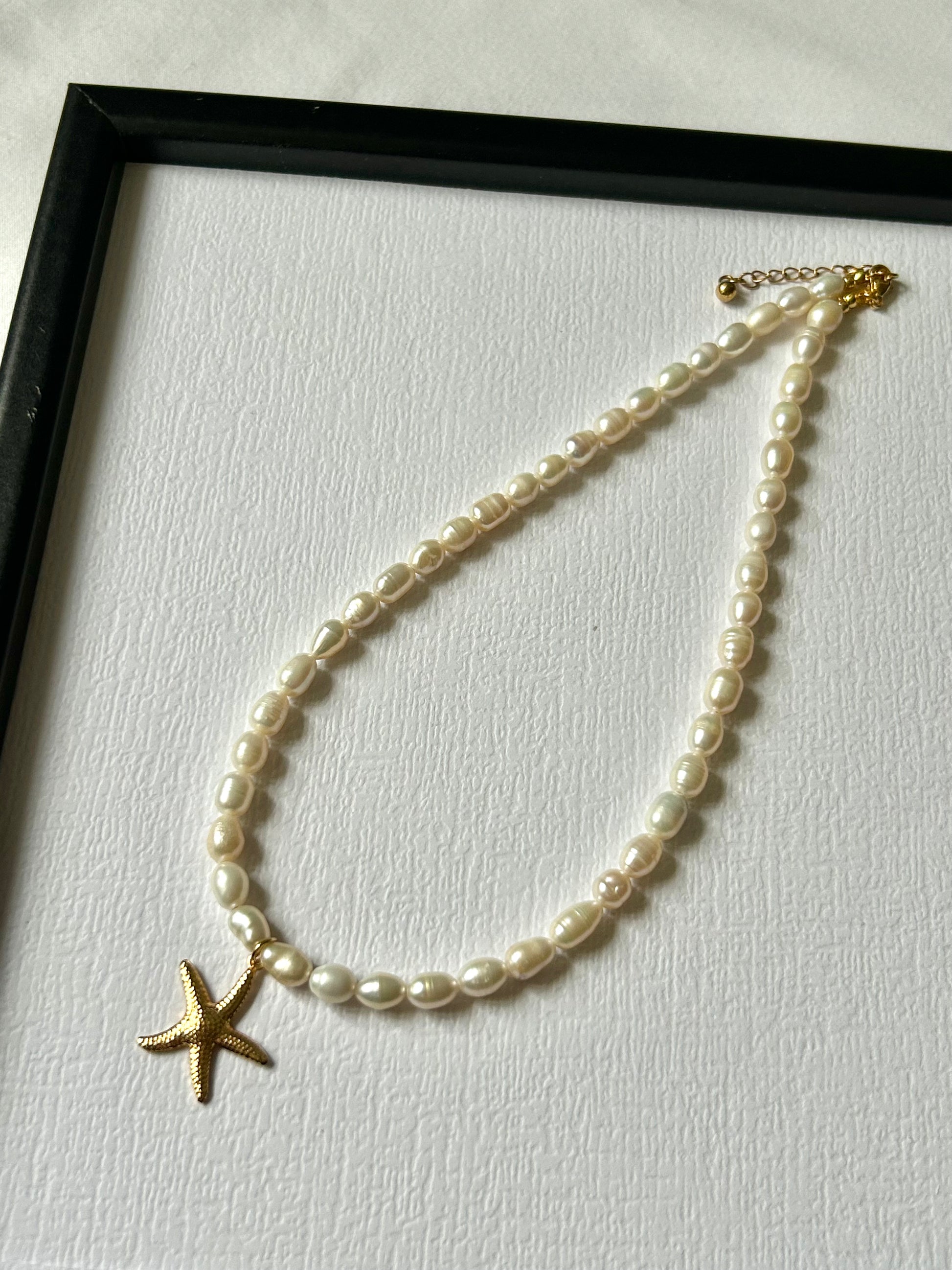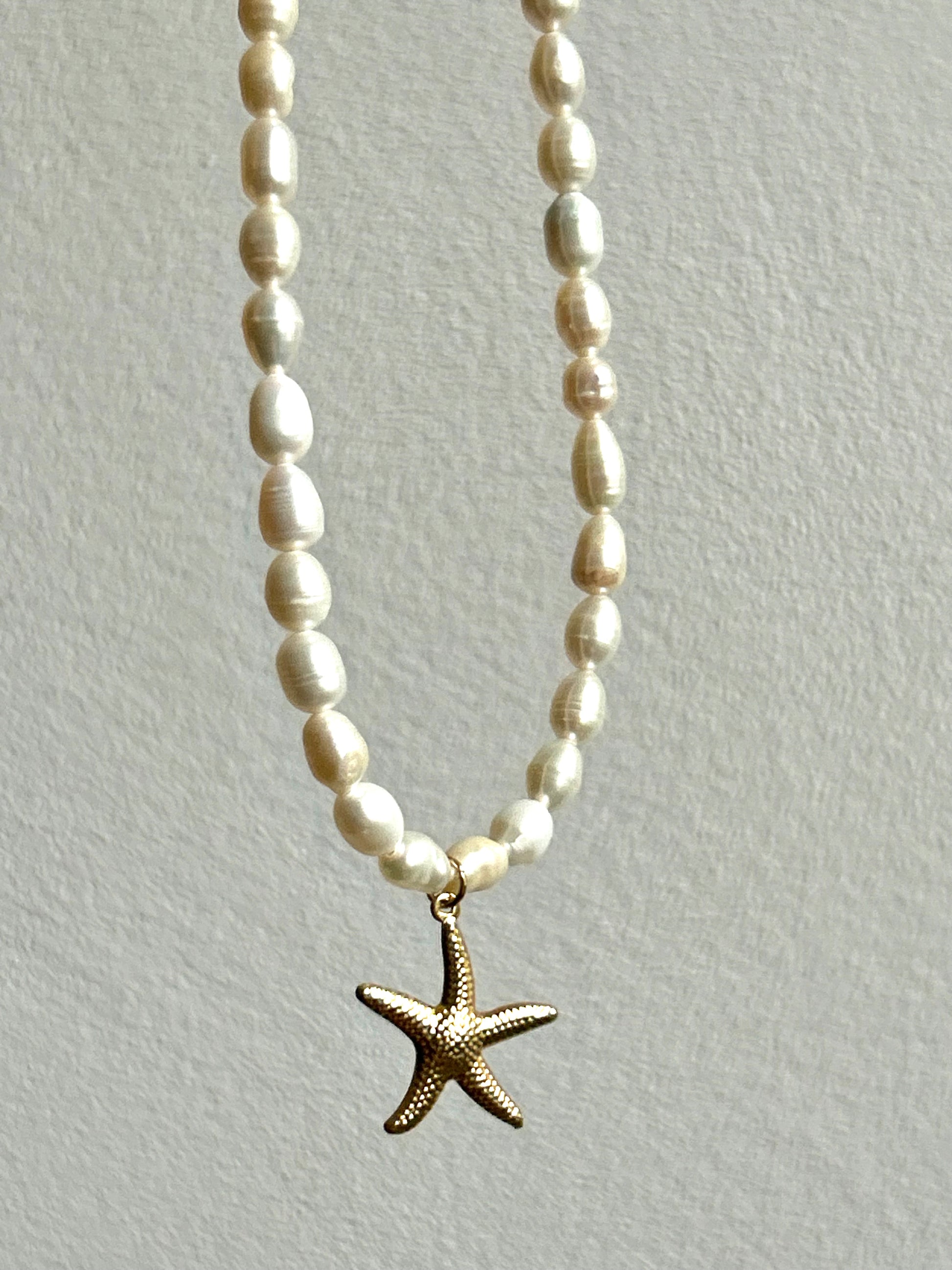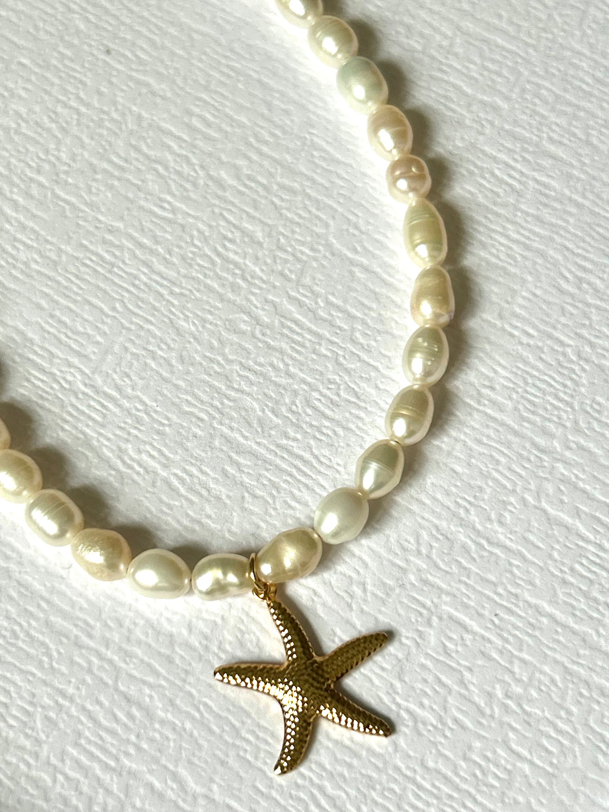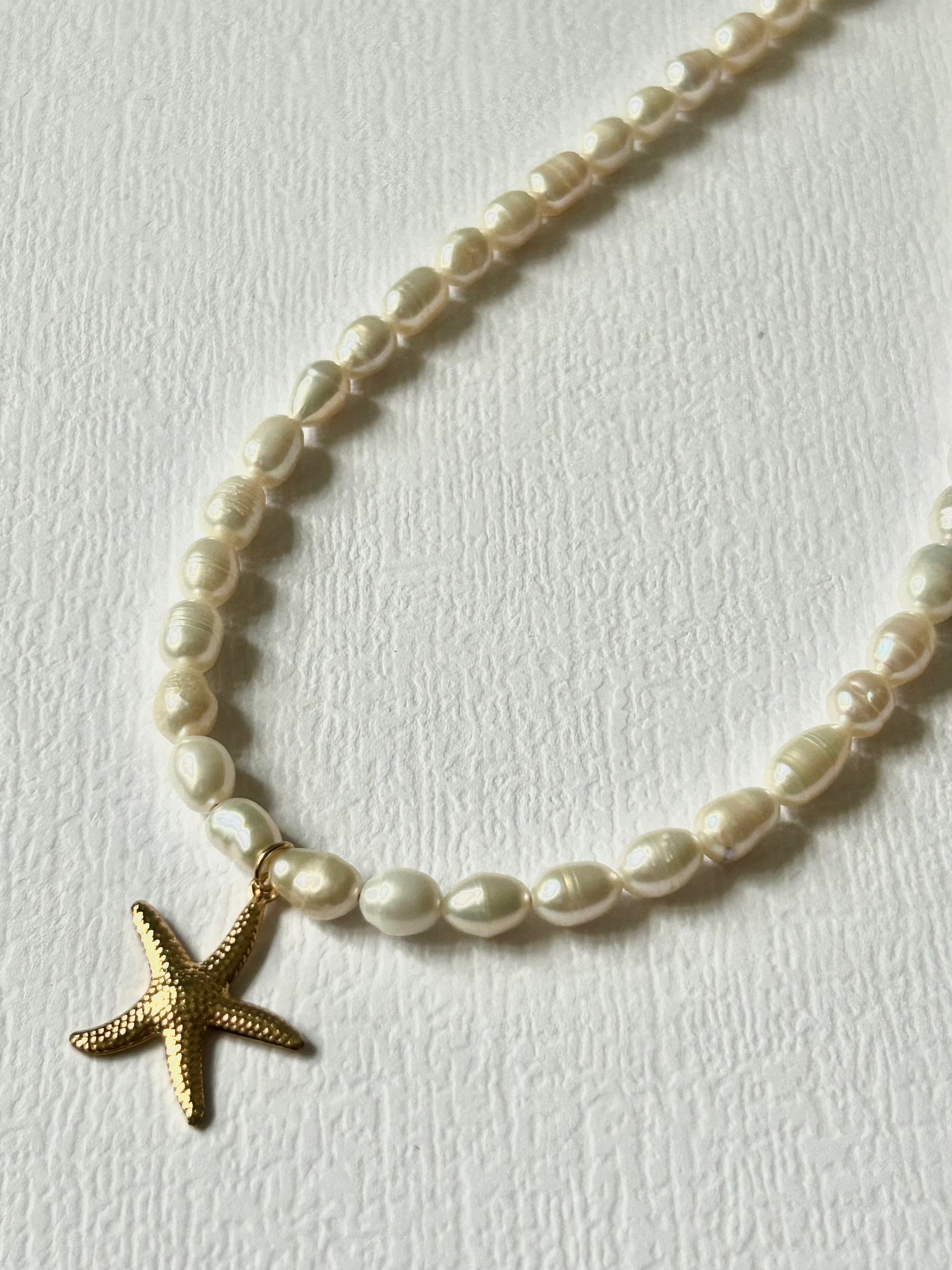 Ręcznie wykonany naszyjnik / choker z pereł naturalnych zwieńczony rozgwiazdą ( 2 cm.) ze stali szlachetnej w kolorze złota.