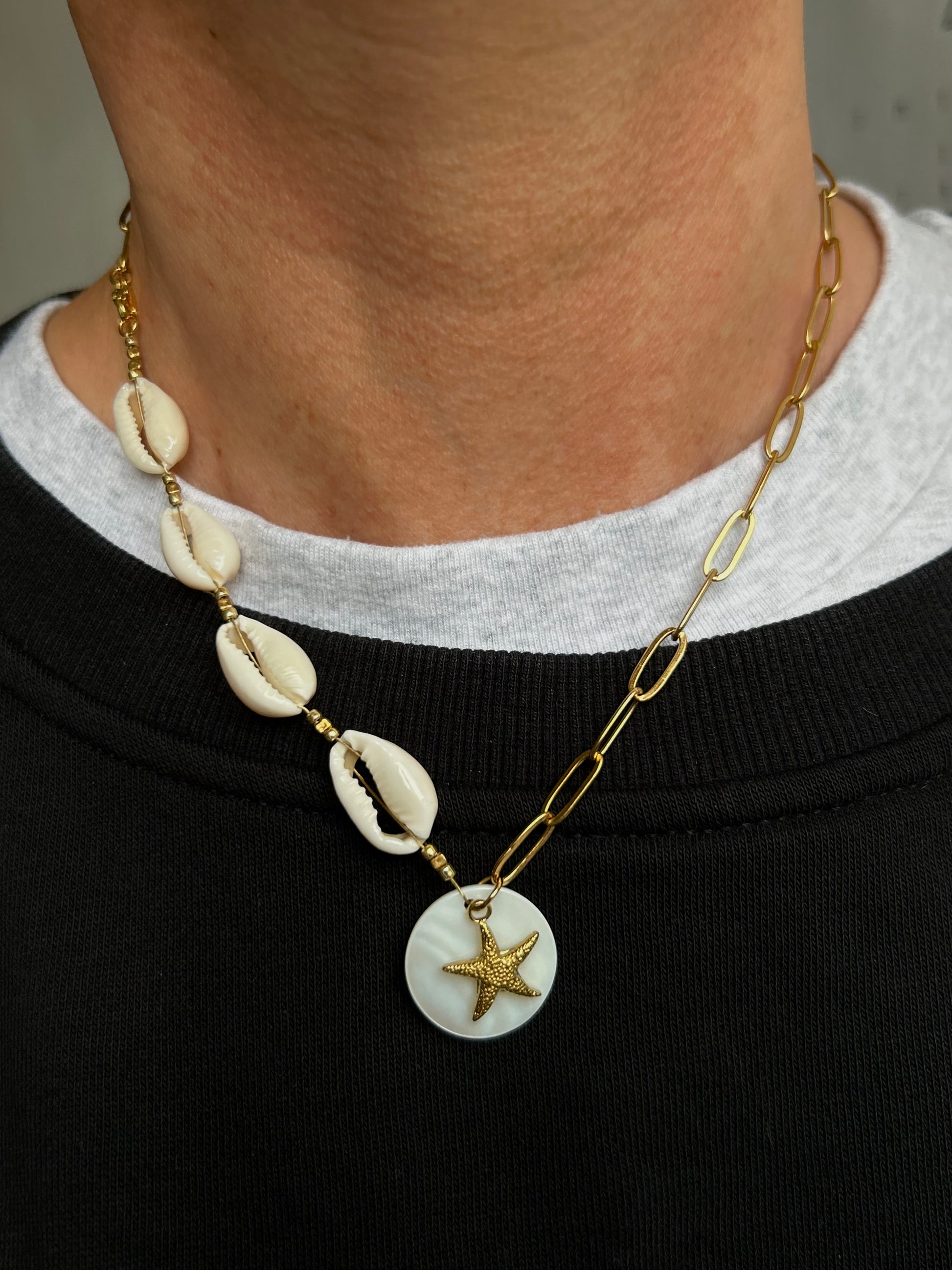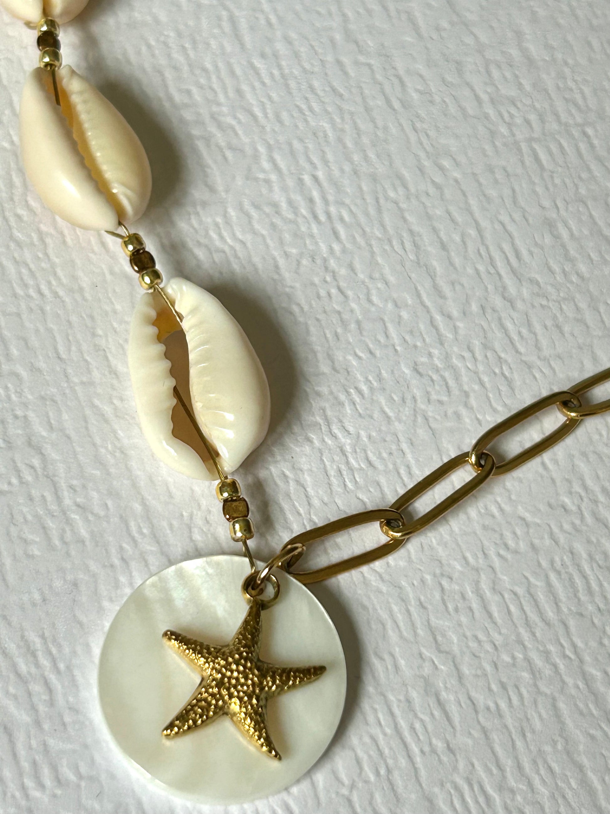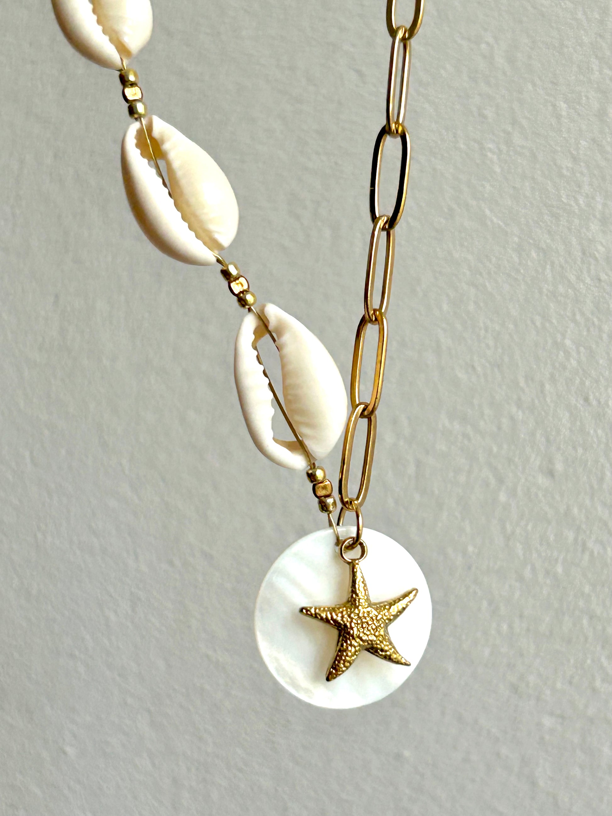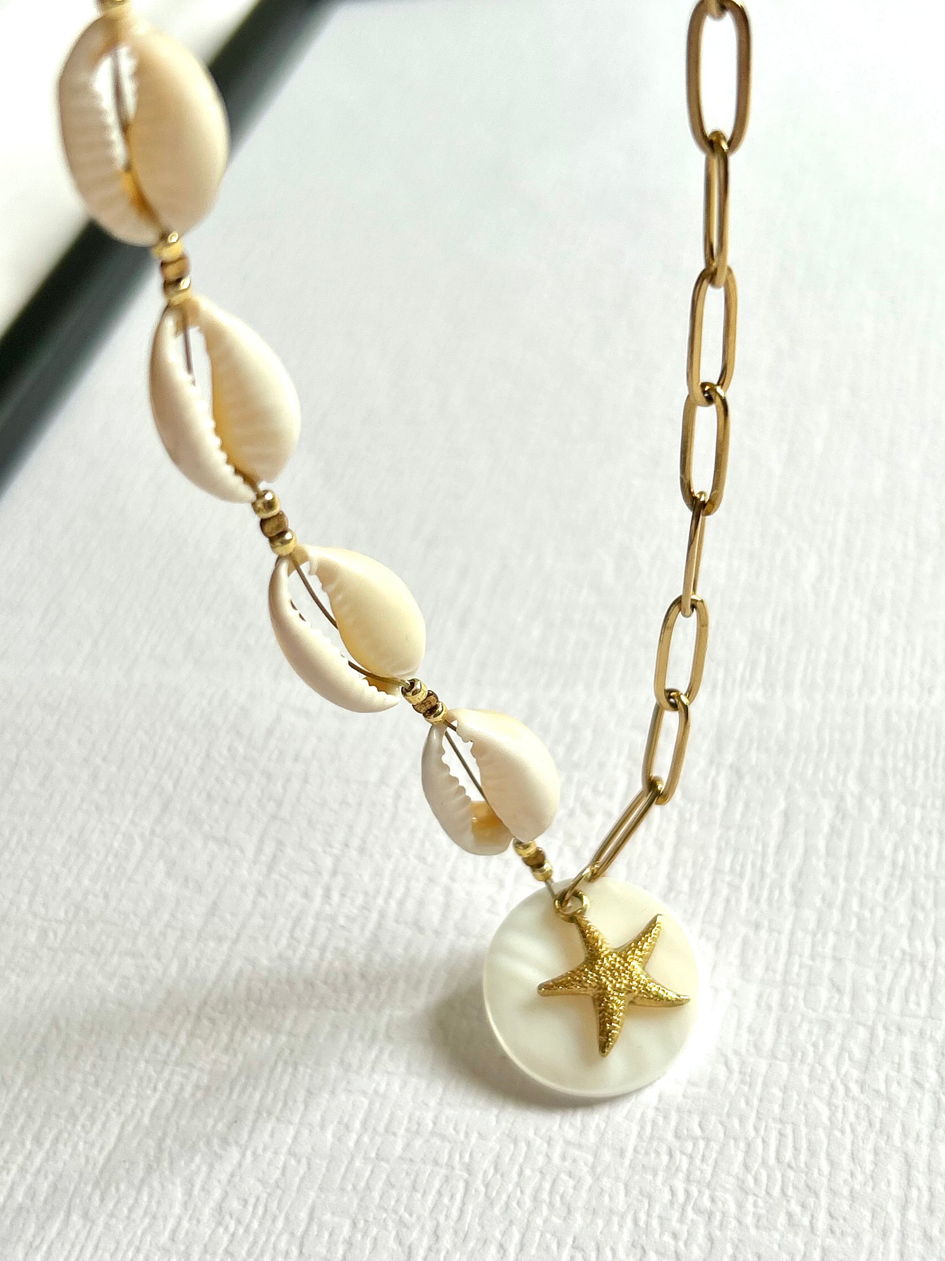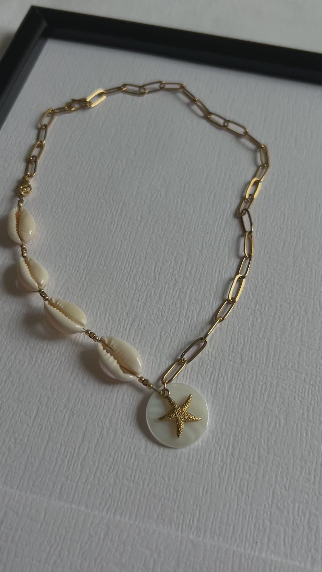 Łączony z muszlami zwieńczony zawieszką " rozgwiazda" na monetce z masy perłowej.
