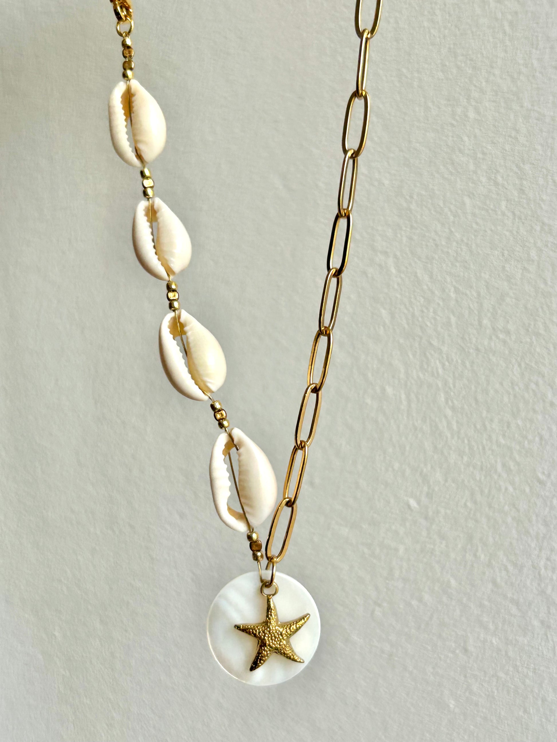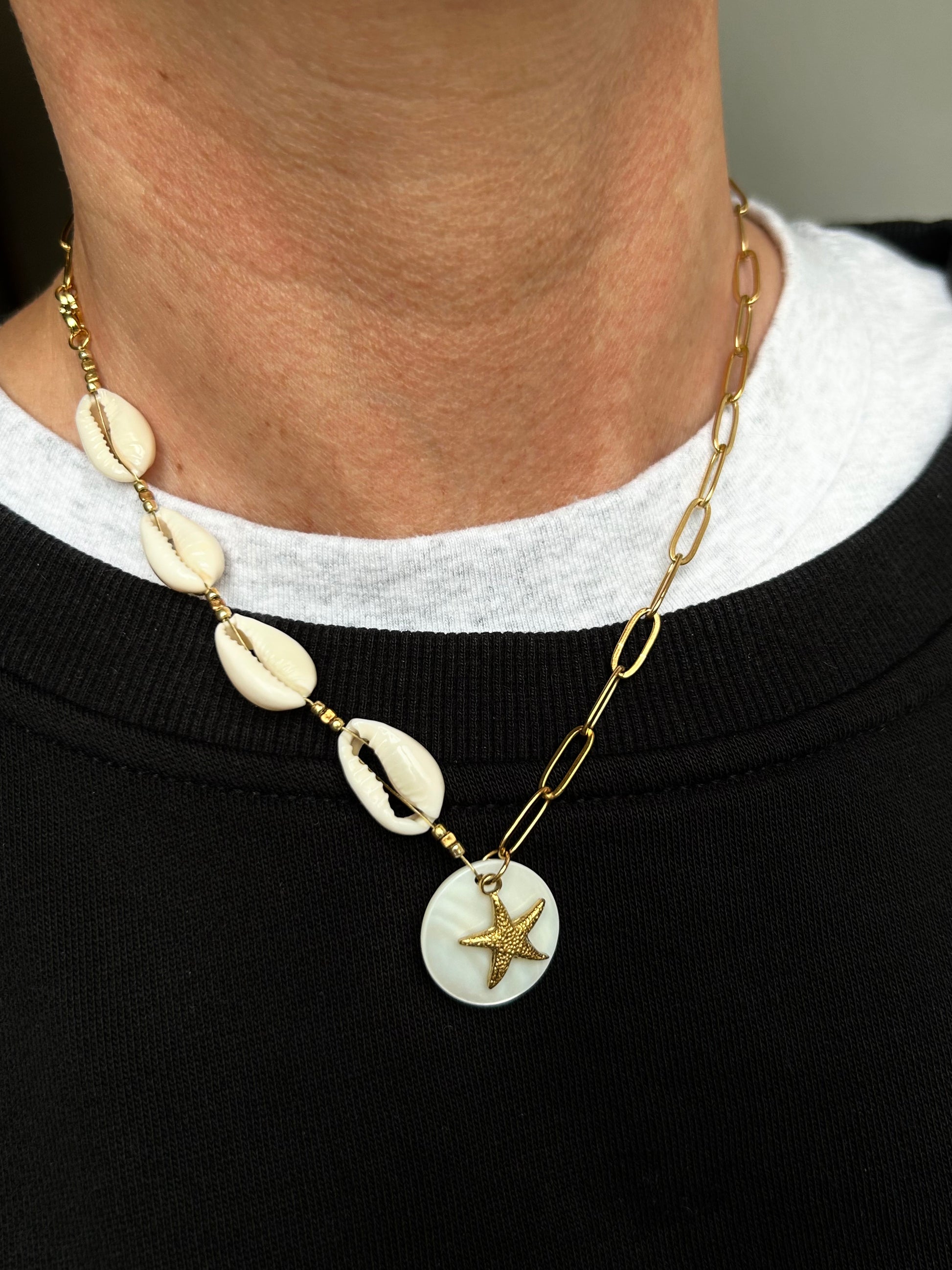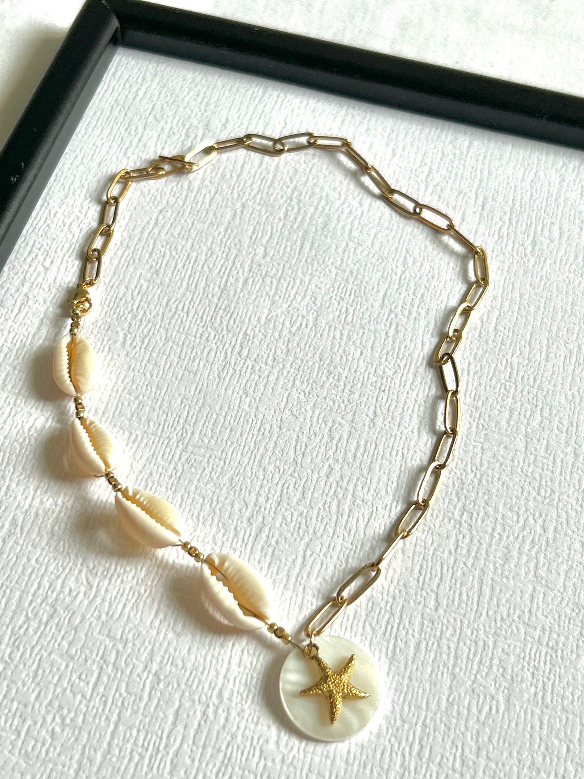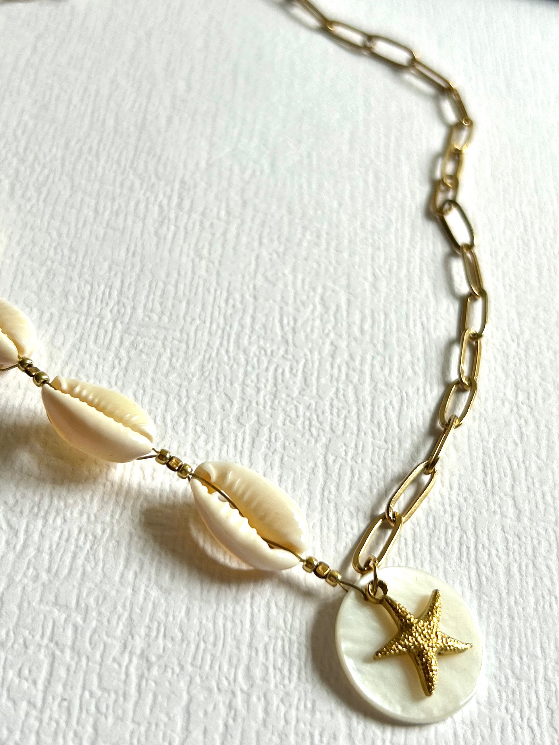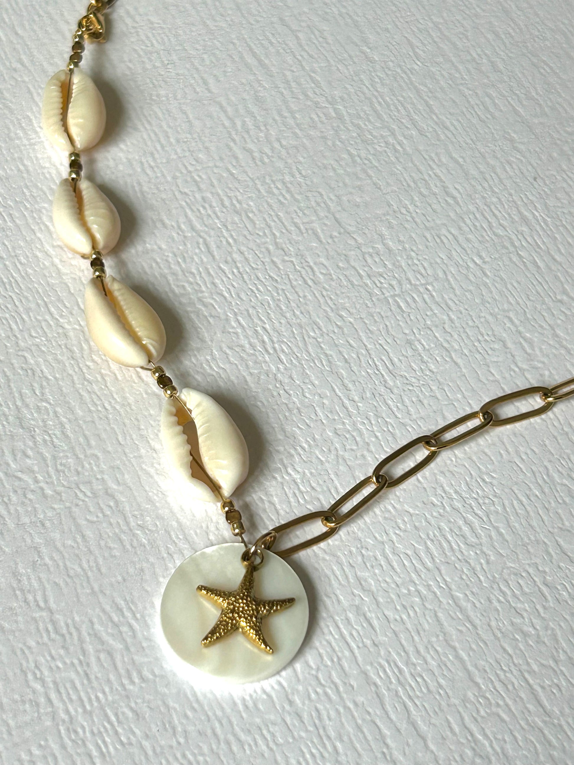 Łączony z muszlami zwieńczony zawieszką " rozgwiazda" na monetce z masy perłowej.