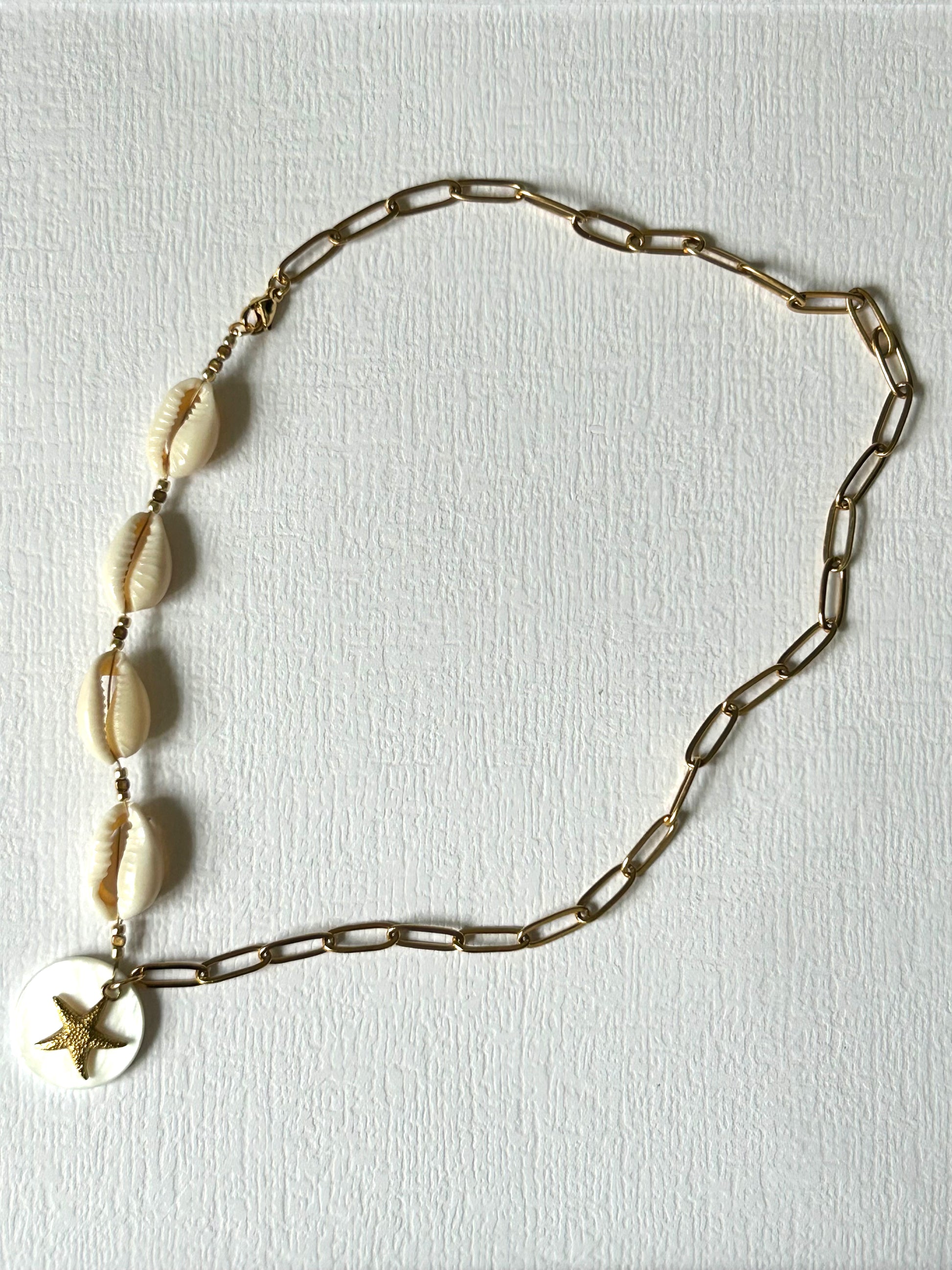 Ręcznie wykonany naszyjnik z łańcuszka i muszelek.